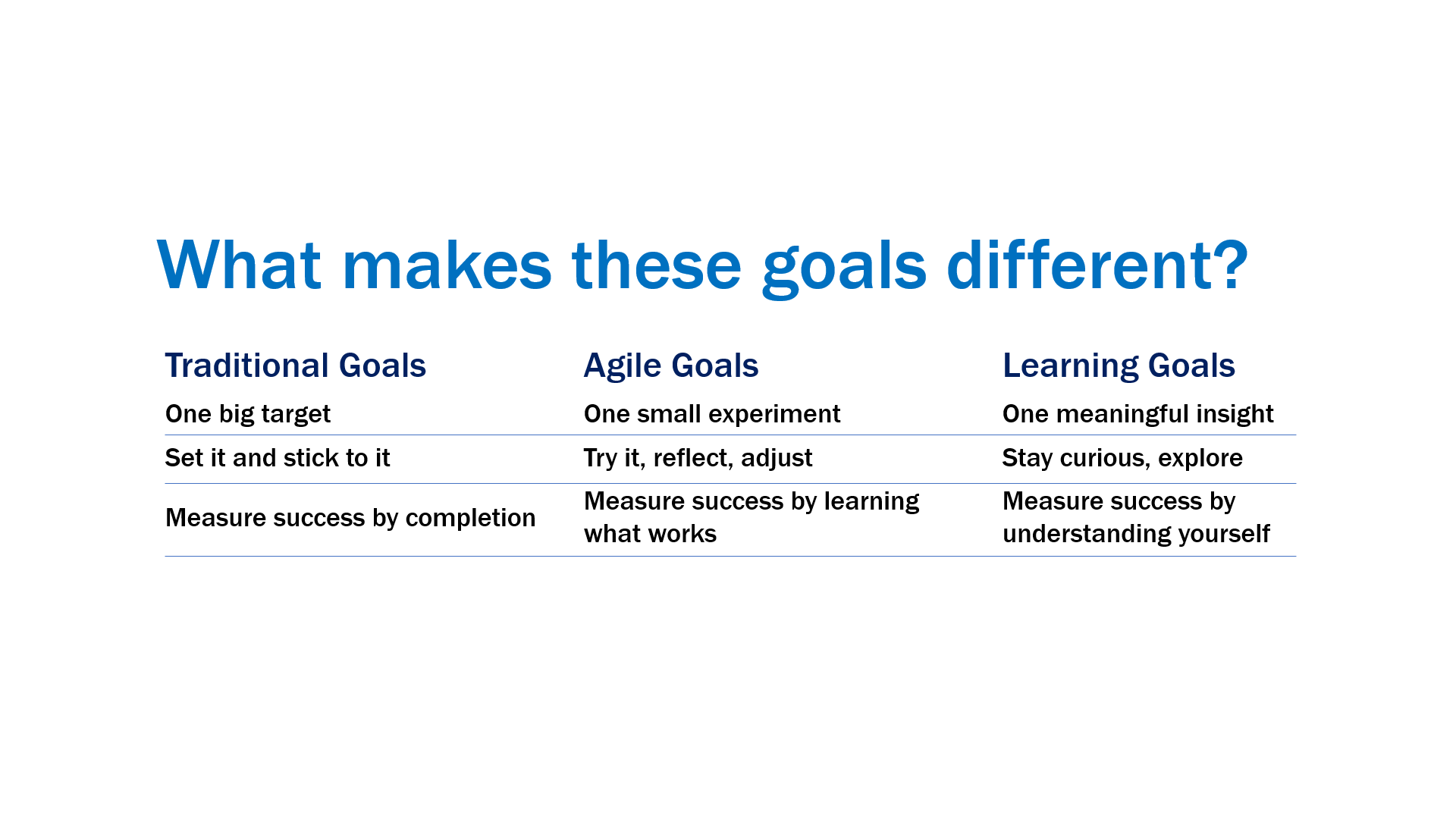 Agile and learning goals let you build momentum without the pressure. They help you stay engaged and curious instead of overwhelmed or discouraged.