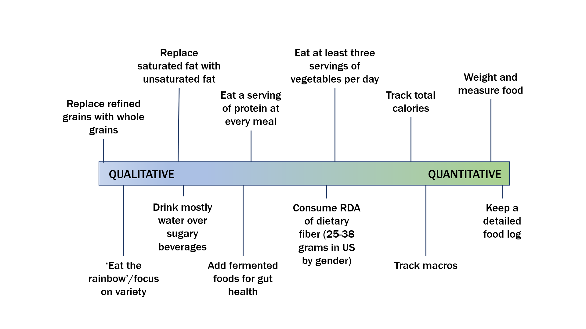 So if we say you need this much protein or that much fiber you're not obligated to hit that target now that you know. Achieving that acceleration is rare - even Formula One drivers start in go-karts. It's why we created a 'Qualitative to Quantitative' chart to give you an idea of how to start. You can still set a goal without exact measures. You can move from left to right picking a qualitative goal - it doesn't have to be one of these - until you feel confident that you've established a habit. Then you can move to a quantitative goal if you want (and you might never want to).